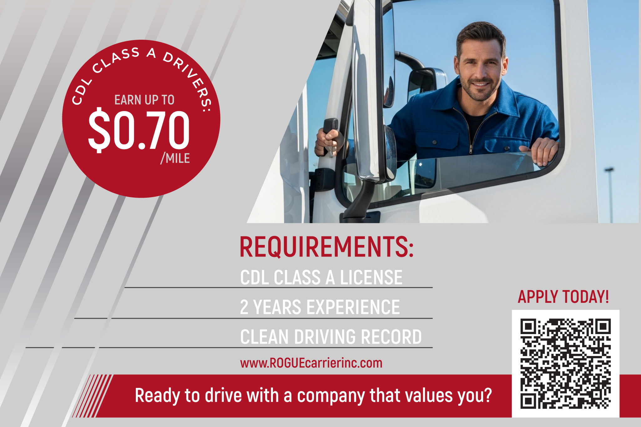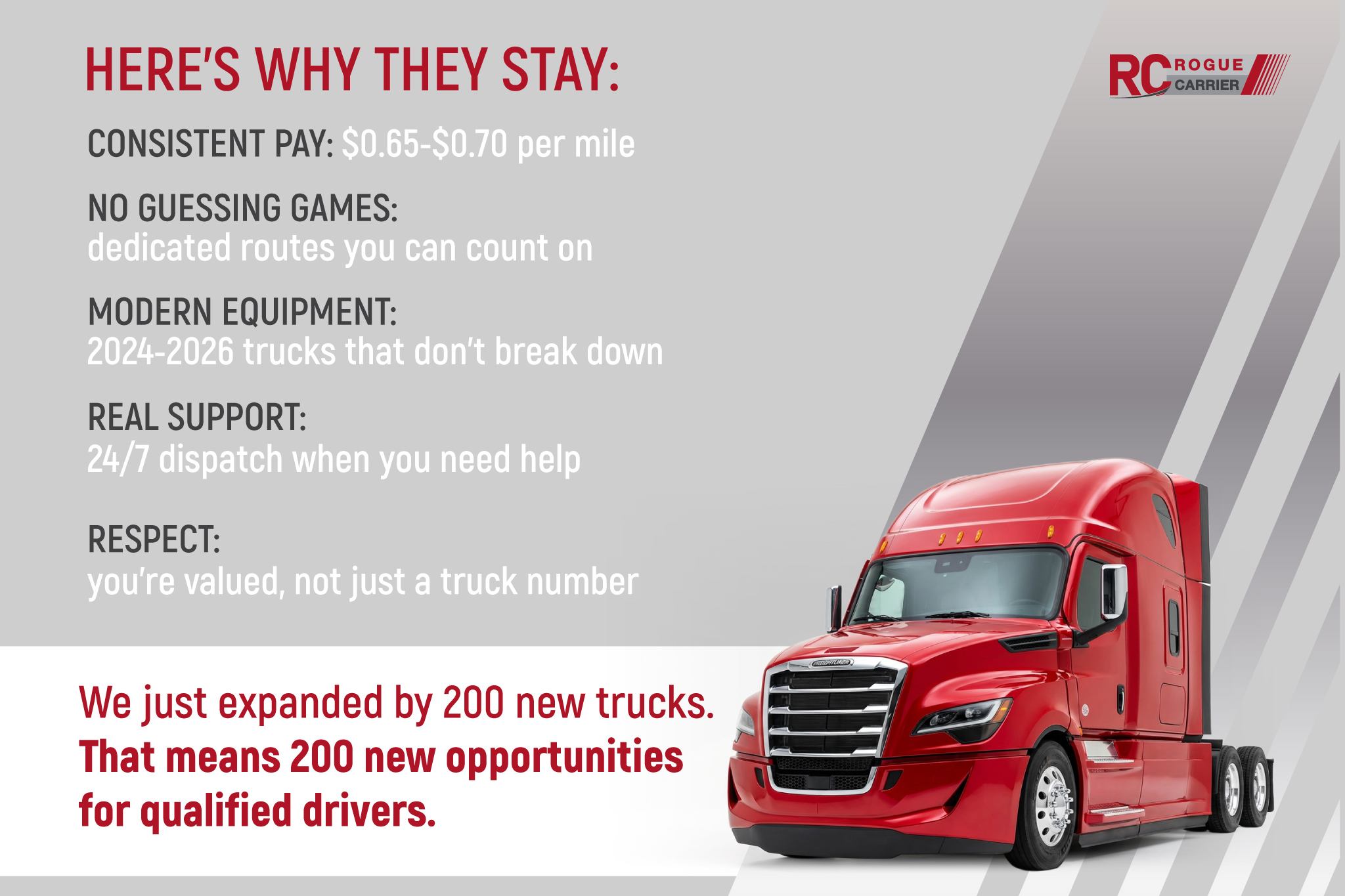 At Rogue Carrier, we deliver more than freight — we deliver reliability, efficiency, and peace of mind. Specializing in dry-van transportation and dedicated routes, we ensure your shipments arrive safely and on time, every time. Our professional team, organized dispatch, and modern fleet make us a trusted partner for businesses across the U.S. For drivers, Rogue Carrier offers a smooth, consistent, and supportive work environment with steady routes, competitive pay, and a company culture built on safety and respect. Whether you’re a shipper seeking dependable logistics or a driver looking for a stable career, Rogue Carrier is where excellence meets opportunity