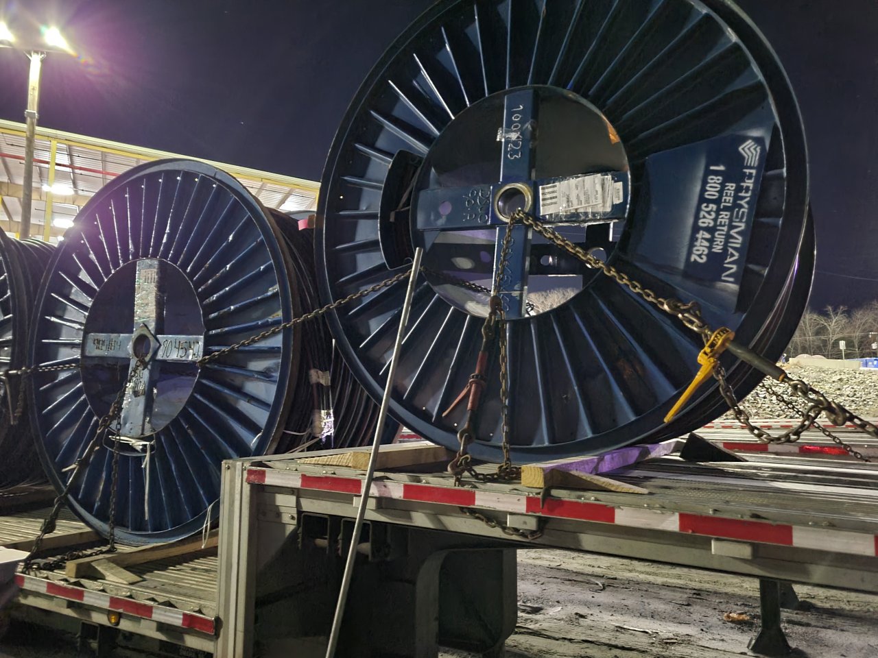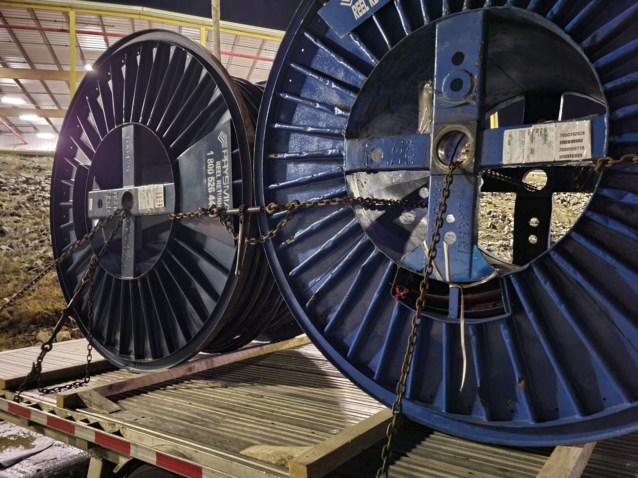 This is my first load away from the terminal. The chains linking the reels together weren't long enough to go through the middle holes.