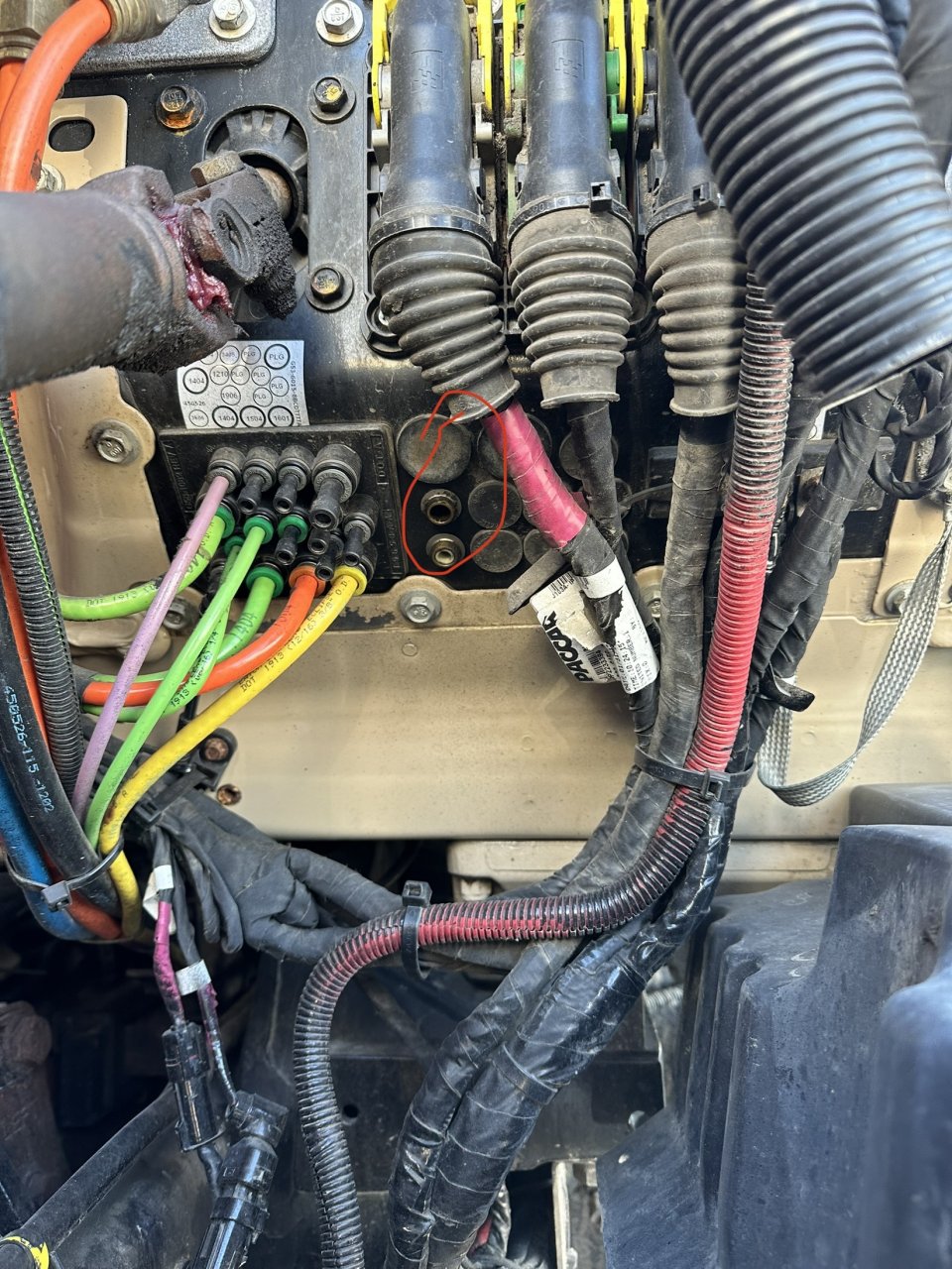 A truck that I do not own but after pushing in the yellow knob i heard a leak from the valve on dash. Applying more pressure i heard a leak from driver side corner of engine. I opened the hood got someone the press service brake and found where the air was coming out of (i attached a pic and circled in red). Some mechanic at my company said it was a plug missing and shoved in a plug. Of course the leak stopped from there but now when you push in yellow knob, it drains air very quick. Also hear hissing sound from yellow truck brake knob when pushed in. I also hear it when its pulled out and apply the service brake hard. Maxi leak can be an issue but I didn’t hear any leaks at the back.