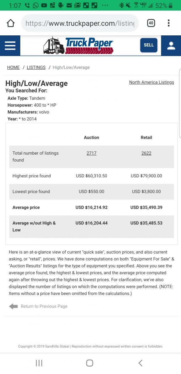 It looks like Volvos are more expensive than KW, but I made a mistake before. I was looking at the auction price and comparing them. For 2015 to current, KW is a little more expensive, but the 579 is a LOT more expensive. I really can't understand why the average price without the high and the low is close to $136,000, and both KW and Volvo are $73,000. That doesn't make any sense, does it?Last edited: Jul 7, 2019
