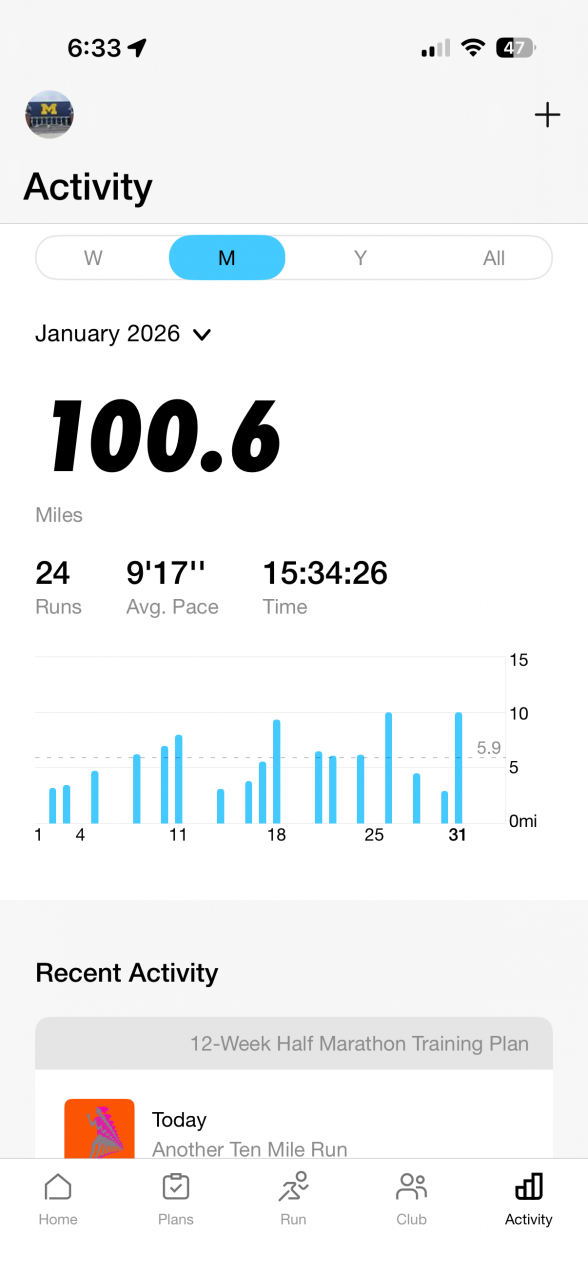 With January in the books, I knocked out 100 miles. With how cold it’s been, I will take the mileage and the pace. I have a 5k race tomorrow for the professional hockey team in town. You finish the race at Center Ice, so that’s nice will be cool. At race time, the temperature is expected to be 9 degrees.