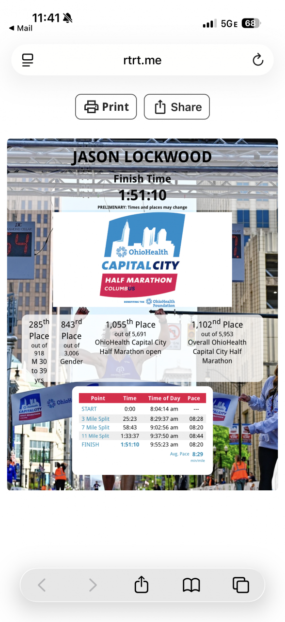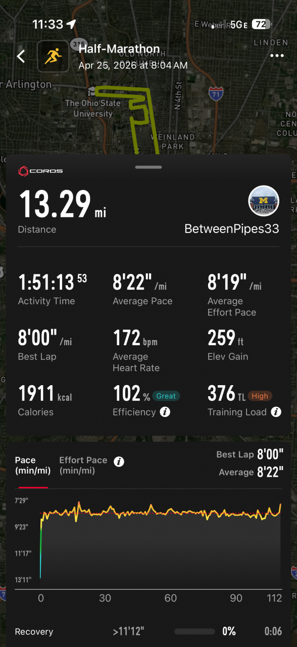 They have the Half, Quarter, and 5k and between all three, 15,000 participants from 44 states and seven countries. It’s a big deal here, along with the Nationwide Children’s Half and Full (I’m signed up for the Full in October). The weather was actually perfect running weather. Low 60’s cloudy and just enough wind to keep you cool when it was in your face.