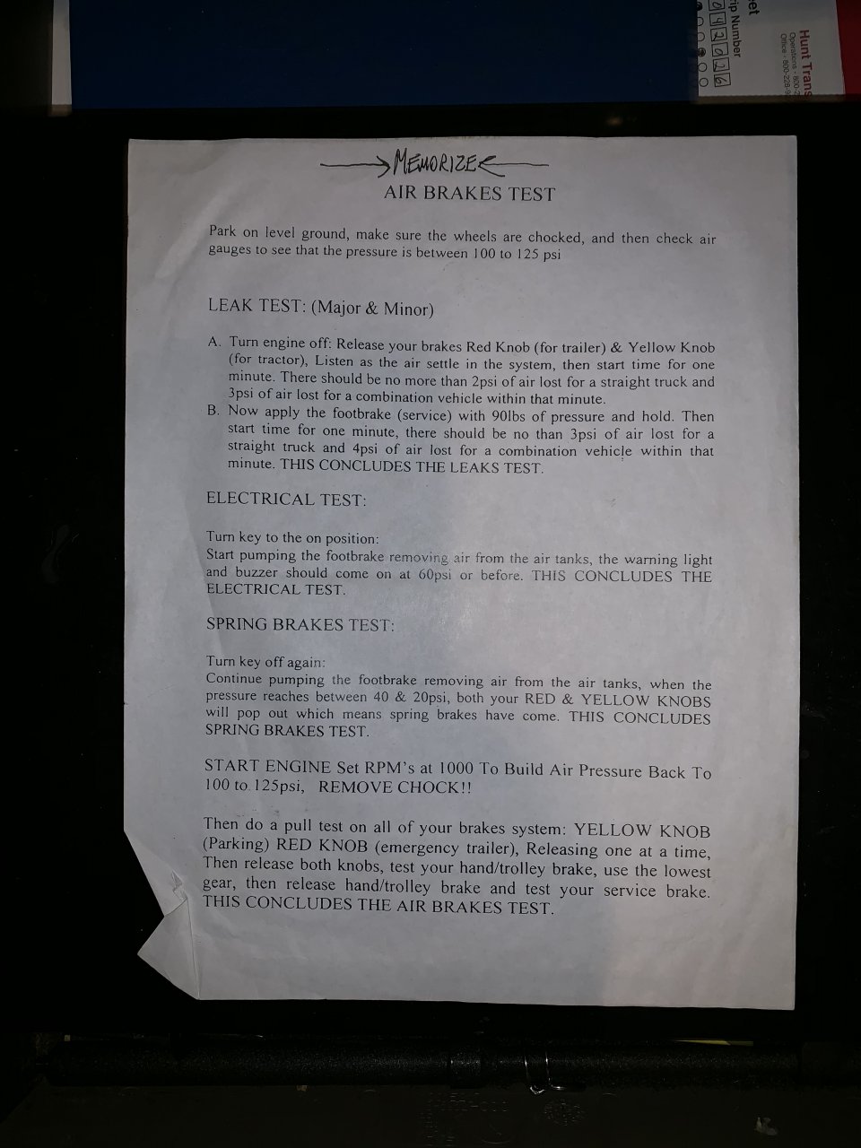 The one page paper is for the brake test, not the pre-trip.....the pre-trip is hard....and it is long. You have to really learn the pre-trip answers for virtually every exposed part on the truck....not easy! Do you know all the parts on the truck....that is the first step in prepping for the tre-trip test.Dan.S, VinnyVincent and BoxCarKidd Thank this. -