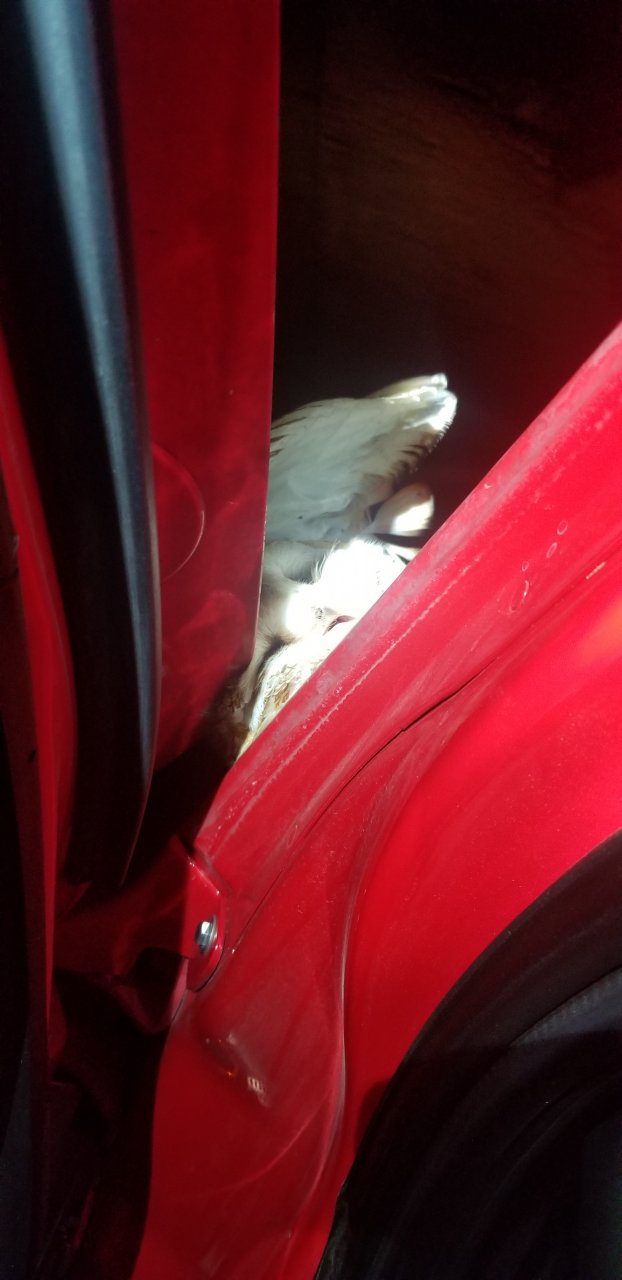 Owl probably thought your Freightliner looked like a mouse while it was diving in for the kill,only to realize at the last second it was going to bite off more than it could chew!!