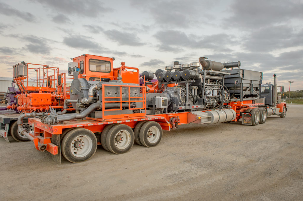 A pump or a mixer features a diesel engine that is at least 3500 horsepower. A "gorilla pump" will have a diesel engine up to 7500 horsepower and put you at about 110,000 lbs gross weight. When you put a dozen or more of these side by side at a frack site, all roaring along at 1500 rpm's, ear protection is mandatory.