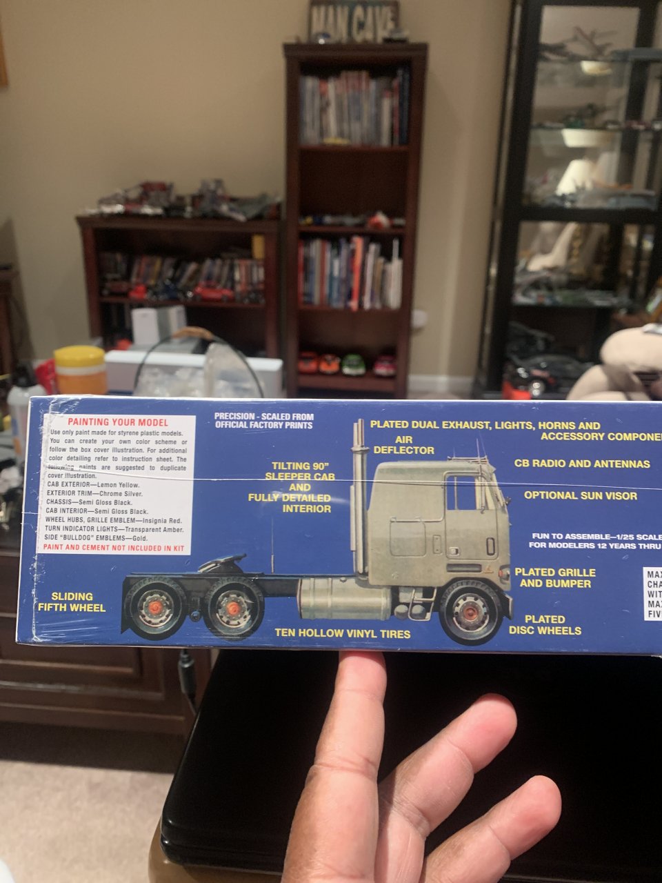 That is the exact last kit I opened up around 2008. I wanted to build a replica of “Pig Pens” “Love Machine” from “Convoy”. I put the chassis and drive train together and painted it up. The cab stripes started to kick my butt. They are very fine and intricate on the real truck let alone the small scale. I got 1/3 of the way done on the cab and put it away back in the box for awhile to get a fresh start later.