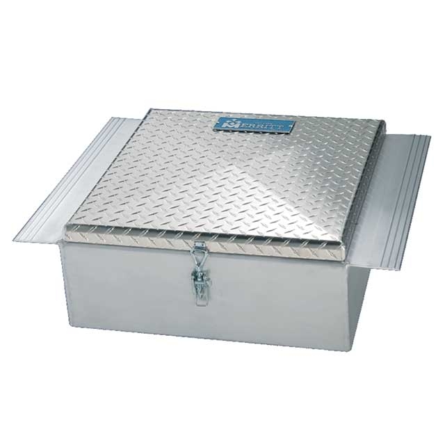 I built my own between the frame rails that way I could maximize space between cross members. I put my battery's in mine so I could do away with the saddle mounted battery boxes and put on step boxes, I'm short on storage. I made the whole deck plate (a local fab shop broke the material) when the lids closed it looks like one long deck plate, I know I know it's dirty, in this picture it was winter. The rear section behind the box is gone now I moved my fifth wheel up.