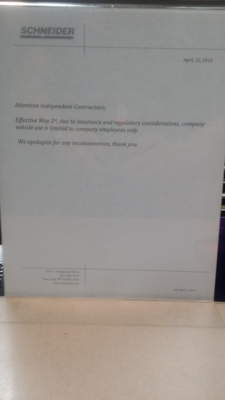 They are trying to cover their collective rectum by trying to keep a class action suit from happening because of the FINE line they walk with us between COMPANY driver and IC. So they take away the car next will be showers or anything else that's a COMPANY driver perk and think that's what differentiates COMPANY from IC.