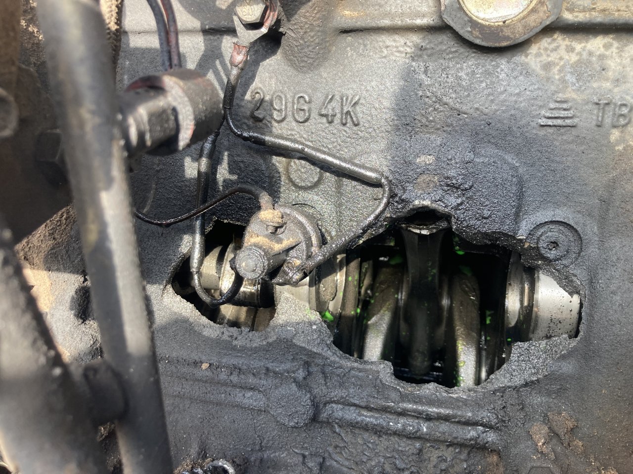 Dude must be the luckiest guy around because the cap from that rod was in the oil pan and he drove it into my shop….all I can figure is the bearing shell was welded together and enough to the big part of the rod to hold it or the cap literally fell off as we were pulling the engine