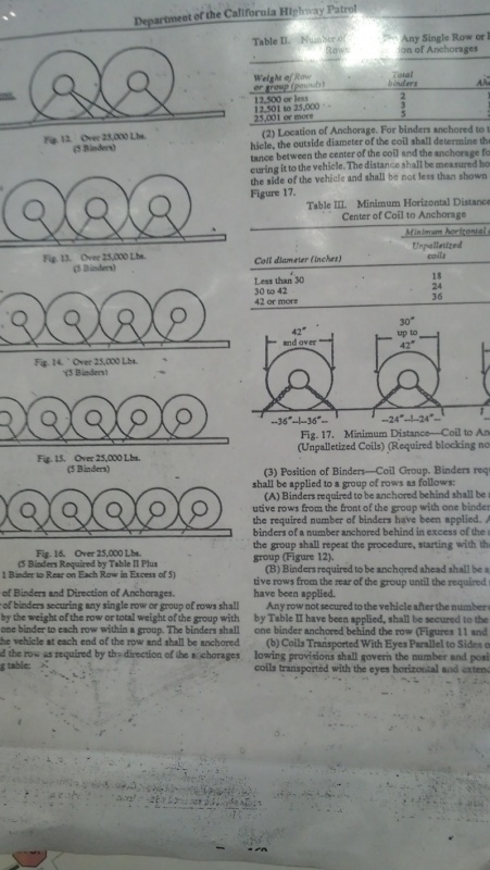 Yea, a bit hard to see, but I did notice at the top it stated California Highway Patrol. Keep in mind, this may be California regulation, which only apply to California Intrastate shipments, as the Federal DOT, does not regulate intrastate shipments. Nor do any state's intrastate regulations apply to interstate shipments. I do know, in years past, California did not allow coil racks, only wood bunks.