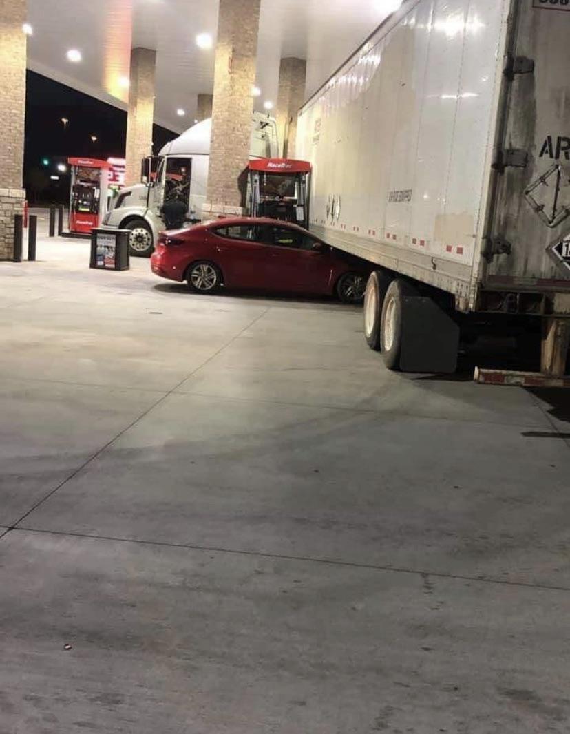 At first i figure this was photoshopped then i seen the tire marks from the trailer turn lmao idk why anybody would even look at that and think yeah i should be able to make it. He also got a placard so im guessin hazmat, u would think a guy pullon hazmatt would got a little more common sense than the rest of usCanadianhauler21, Mike2633, BoxCarKidd and 3 others Thank this.