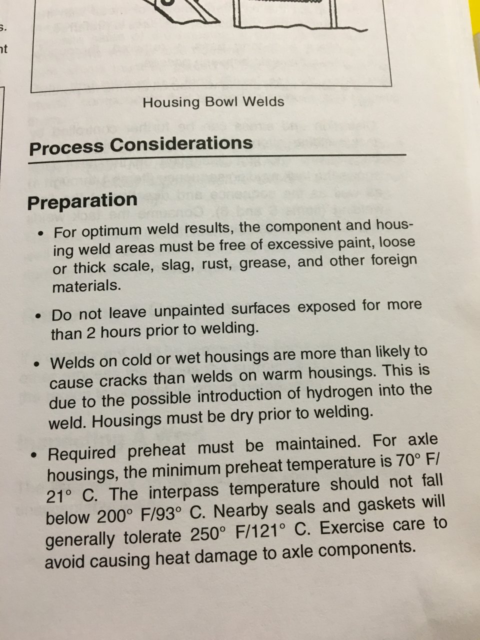 I want the brackets to be flush and or flat with the axle. If the dowl pin is sheared off I used to drive it into the housing and pluck it out of the axle hole. Now, after seeing someone else do this, I torque the U-bolts and weld the spring seat to the axle. No wimpy weld here! Do not over torque the u-bolts. I thank severally over tightened u-bolts can damage the housing. Do not weld the cracks with air on the housing and check for leaks before and after grinding.