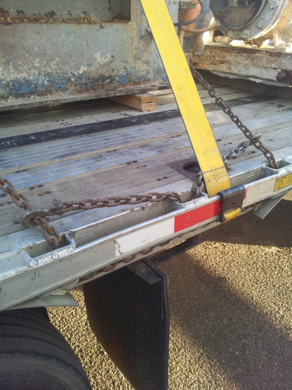 My question is about my chaining. This is directly in the middle of my spread. I only had one pocket in the middle and two other half pockets attacked to each wheelwell. I didn't know what else to do then to reload the trailer. The unit weighs about 7000#.
