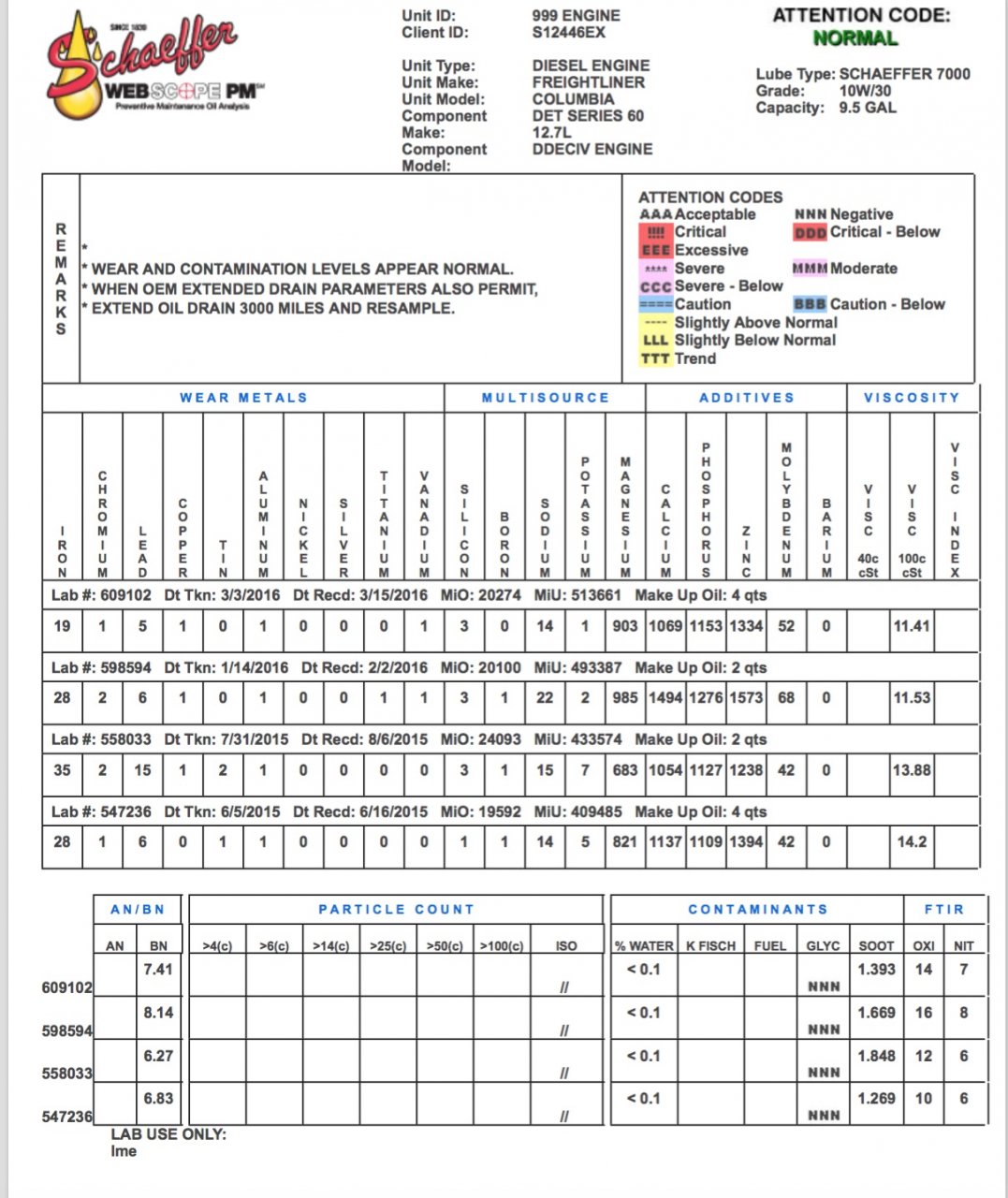 I run a Delo blend in my DD15 too, and have been happy with my samples. I lube at 15k and change oil at 30k.