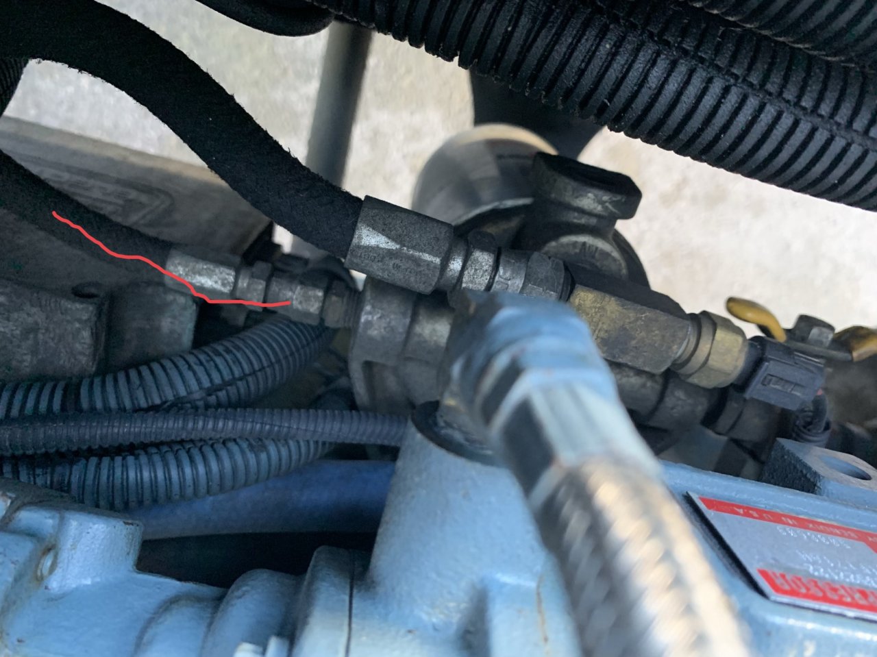 If you can figure it out, the red line is fuel pressure, you should have a cap on that fitting