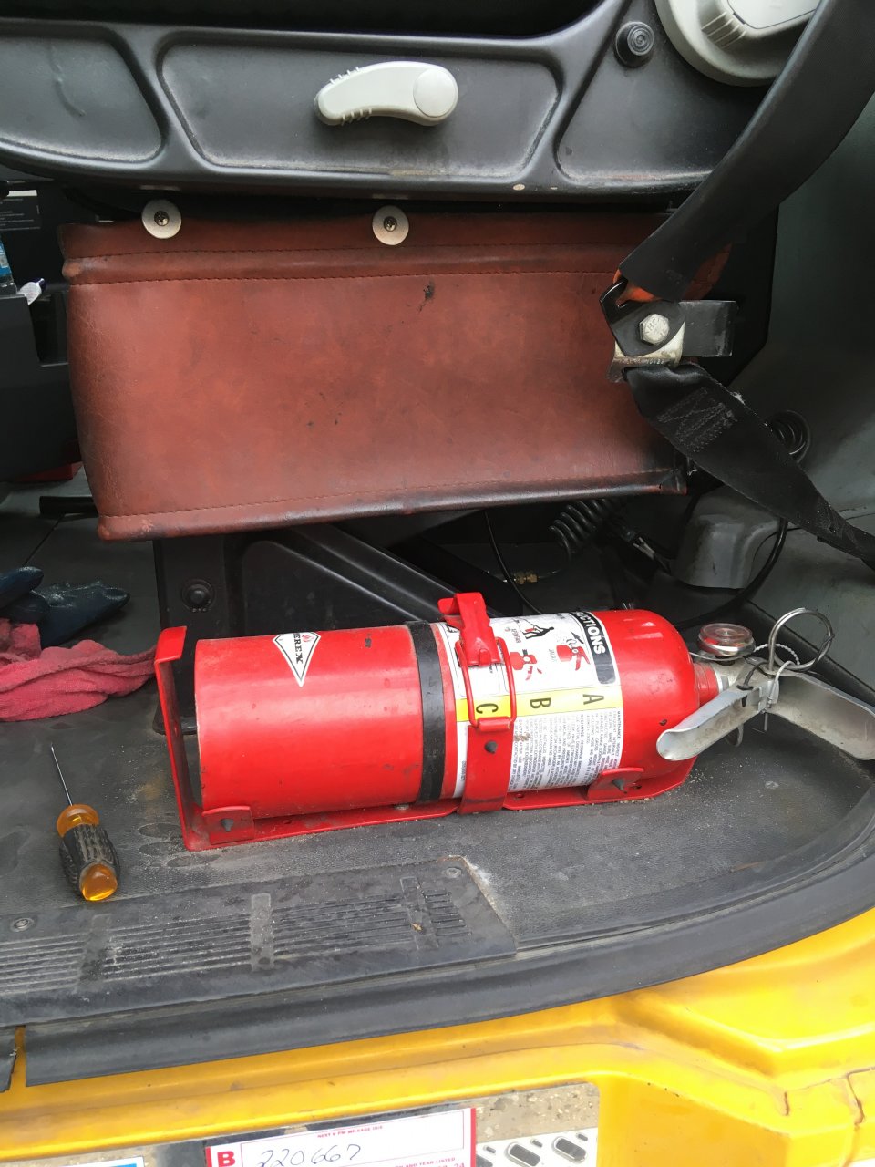 After breaking the mounting bracket and zip tie tag on the extinguisher from constantly putting my tool box and other things on top of it, I finally relocated the mounting location for the new one I bought today.
