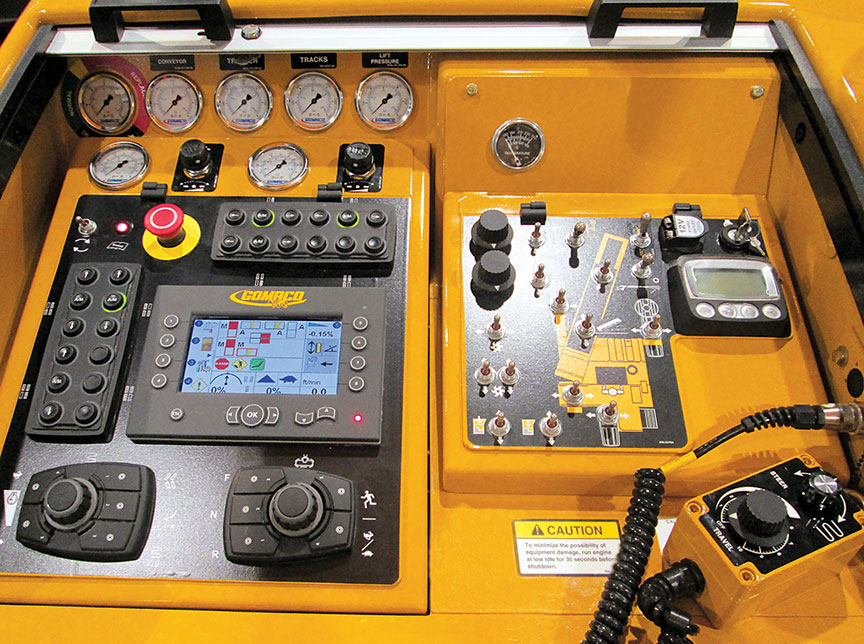 That's a Gomaco control panel, probably a 3600 since it only has three tracks. once you figure it out it's pretty easy but it has a couple of stupid safety features. First time I moved one it took me a minute to figure out that in low range you have dial it to about 20% before you notice it moving.