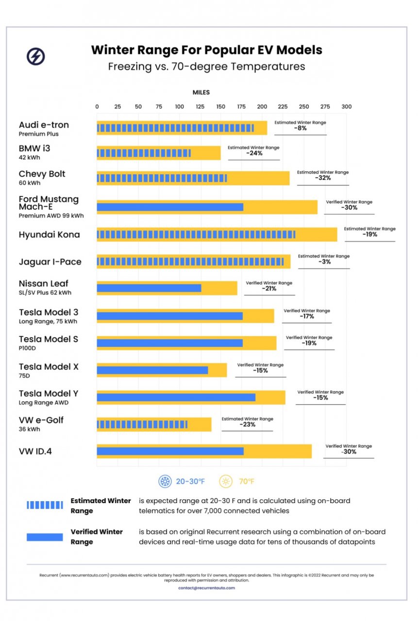 2) Cold Weather Fade (CWF)-The electrochemical reactions that power the battery get weaker in cold weather. One of the busiest traffic lanes is I-80 across Wyoming which regularly has Winter wind chills from 0 to -20 degrees F. Recurrent Auto did a study of electric cars and saw about a 25% CWF in freezing weather. The winter temps in Wyoming are way below freezing so that 25% loss will be higher.