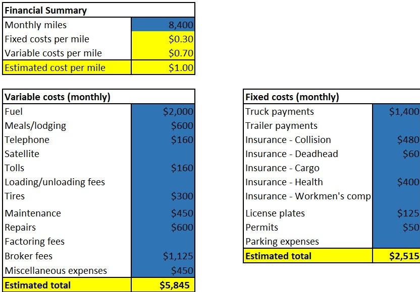 Variables are the expenses when the truck moves. The list is actually short. Fuel,Tolls, tire and maintenance funds. These are going to move around based on time and miles. You can do a best guess average, then go 5,10,15 and 20 percent above and below that average to see how the numbers change.