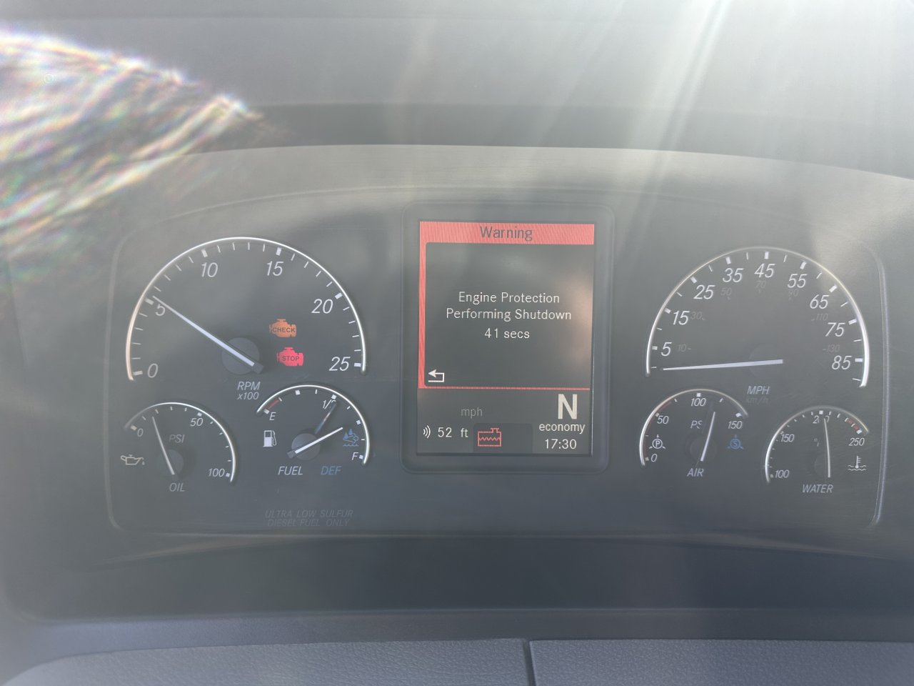 Hello everyone, my 2019 Cascadia DD15 got a problem recently, a warning sign always pops up on dash saying “Engine protection performing shutdown” with a sixty second countdown. The amber color engine check sign, red color engine stop sign, and low coolant sign show up as well. It appears about twenty times a day, probably 1/3 of the time it leads to a shutdown IMG_0621.jpeg when countdown finishes , but most of the time the countdown disappears midway through or nothing happens even after finishing its countdown. I sent it to the dealer twice, but they couldn’t find what’s going on because it runs normally when the diagnostic computer is linked up.