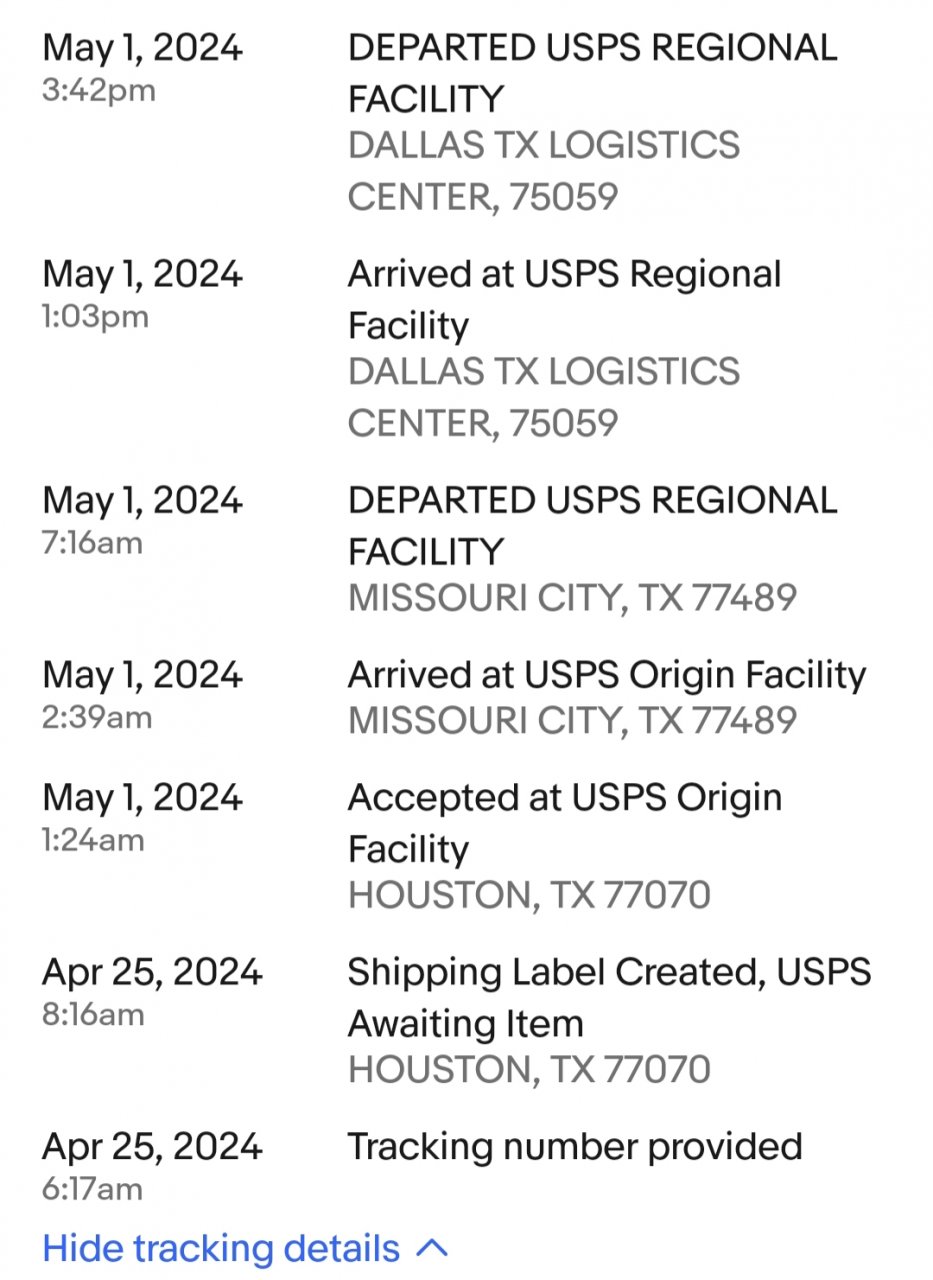 Your seller printed the label on the 25th and didn’t had it over to postal service until May 1st, won’t get on a truck till late the 1st if it was shipped ground instead of priority two days transit is about correct.
