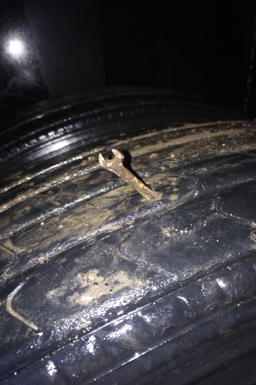 Still trying to figure out how exactly the round end of a wrench managed to poke its way through the tire.![]()