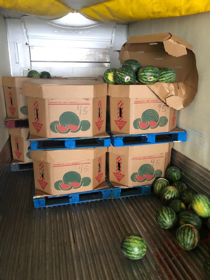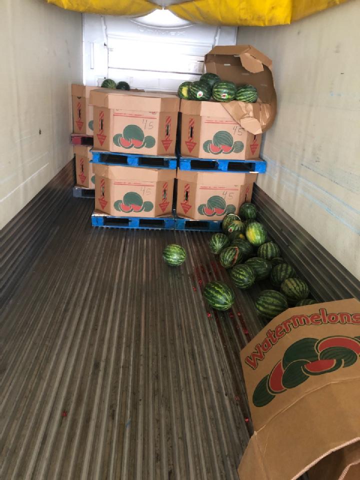 I did a load of watermelons from NC to PA. It was a double-stacked load. During unloading, one of the boxes came loose and the watermelons spilled everywhere (unloading error). There were only 9 pallets left including the one that spilled. The receiver rejected the remaining load due to spillage and not being able to get to the back pallets (photos attached).