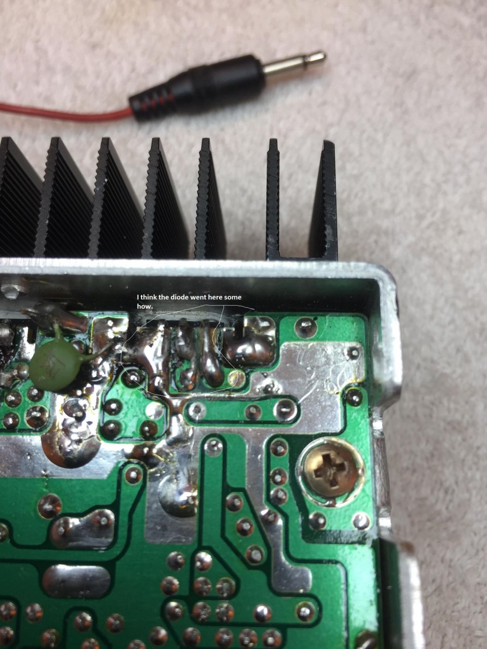 Hi, First off I hope I'm posting this question in the right area. OK I traded for a General Lee radio. when I got it, it wasn't working. I replaced the driver the one all the way to the right with the solder side of the board up. Well I know there was a diode placed inline. I still have the diode but forgot where it goes and what direction it goes in, Help Please?