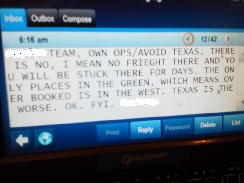 @blsqueak-- I just got this message this morning, evidently any freight available in Texas is being saved for the local TX folk, OTR's are SOL.Attached Files: