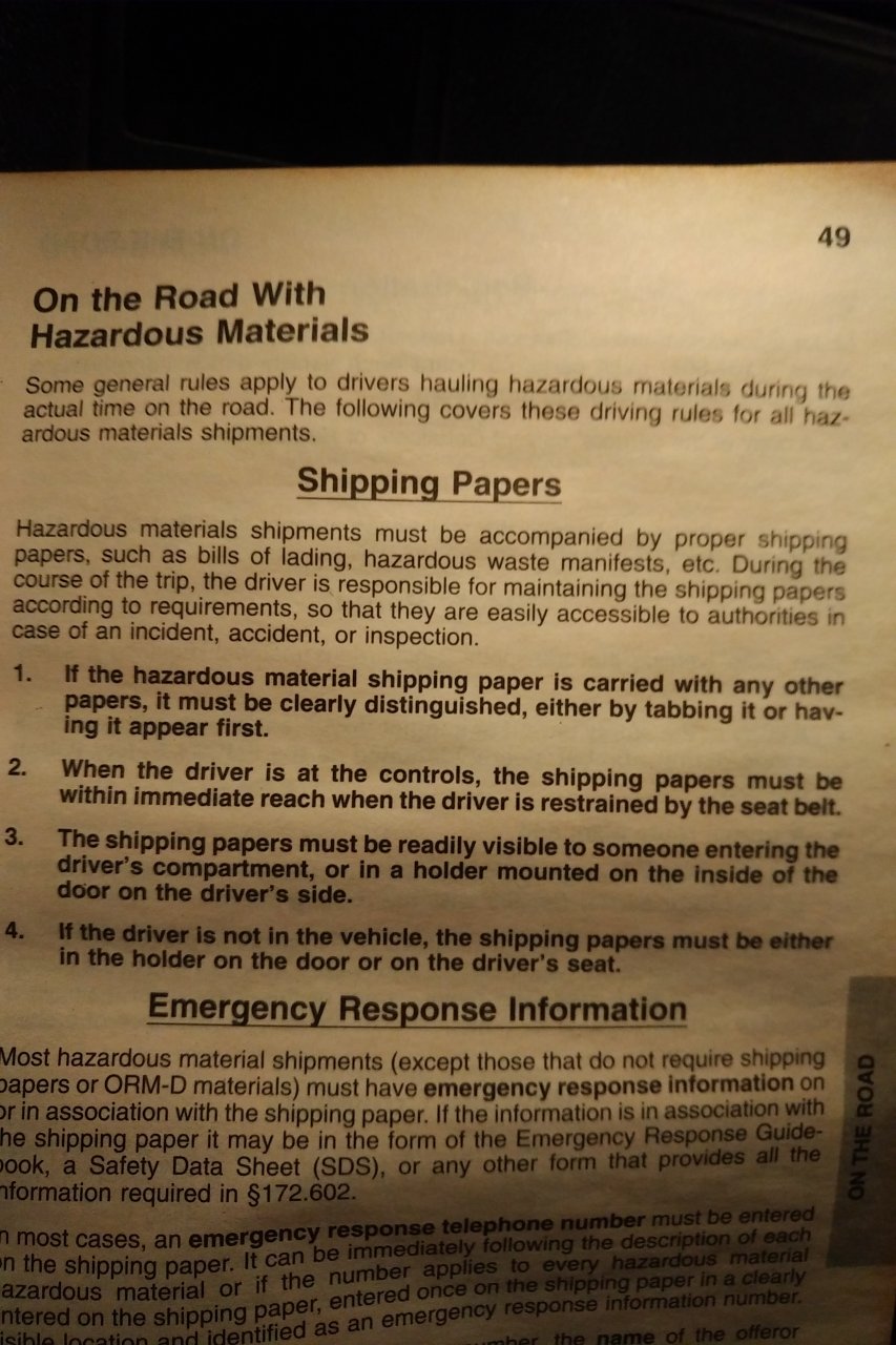 And for anybody wondering why the law is so tight on shipping papers locations should think about emergency situations. In this situation trained emergency responders know where to look for the vital information about what is hauled and how much is hauled. The papers have to be done in such a way responders will waste no time when they start clean ups because in some situations they have no idea how to clean until they know what they are cleaning up. AND they are just as strict on rail shipments.