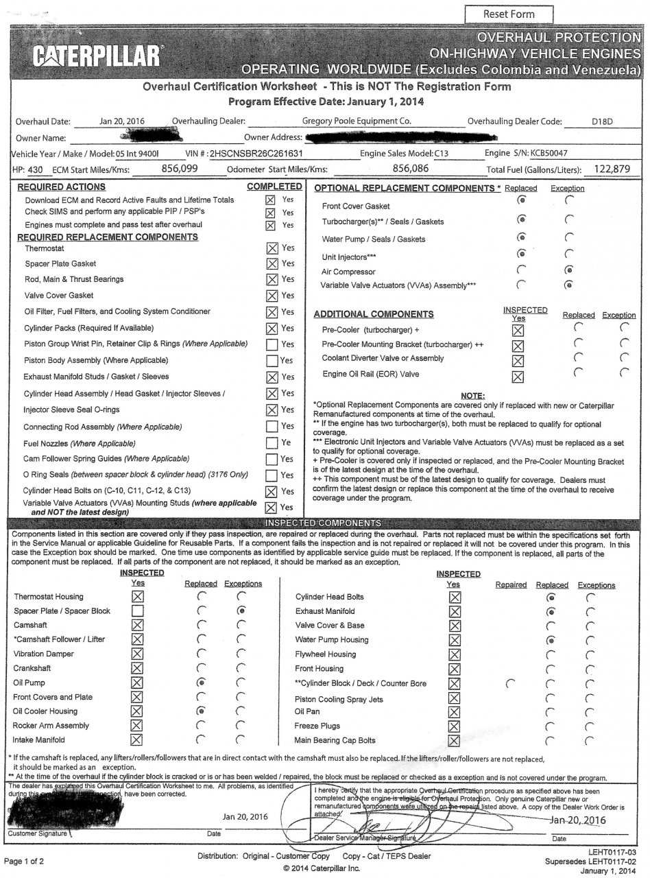I just had a platinum done about 3 weeks ago. Cost me 23,800. After hearing your story I'm glad I let cat do it. Here is the warranty