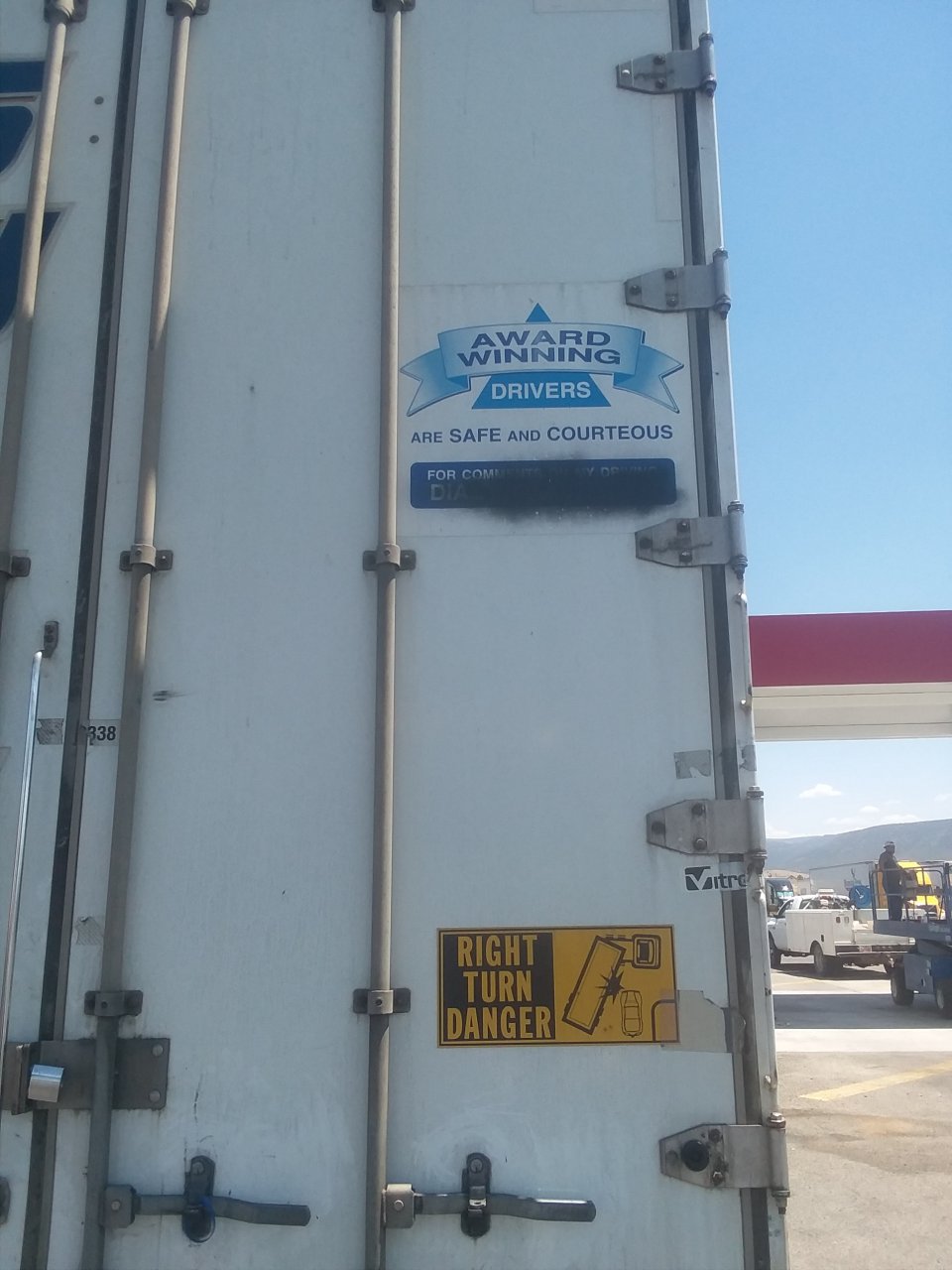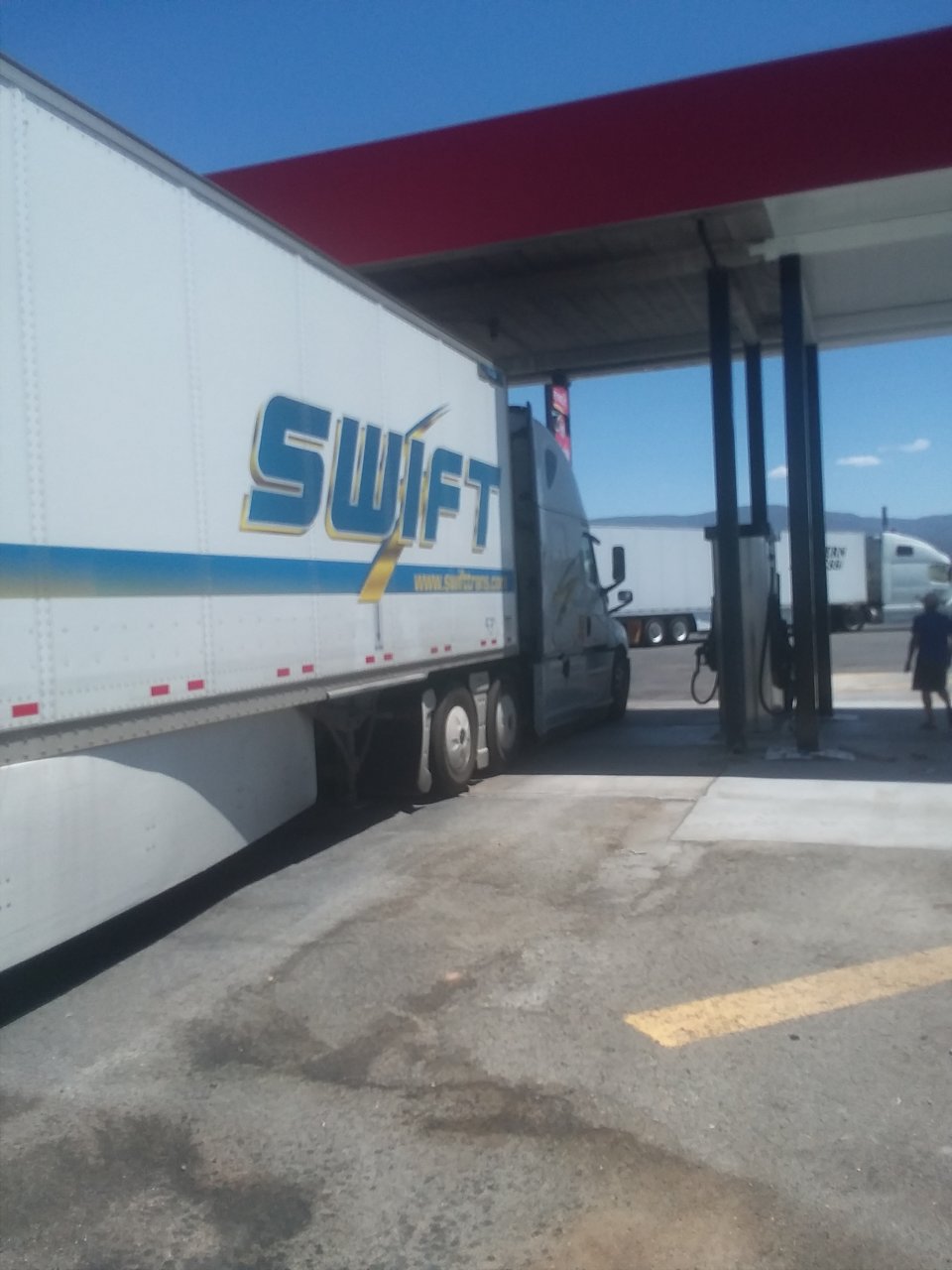 Im thinking if he was a courteous driver he would have pulled forward so someone else can get fuel. But maybe when he acquired that trailer he might have crossed that out. No courtesy until he gets the next trailer.