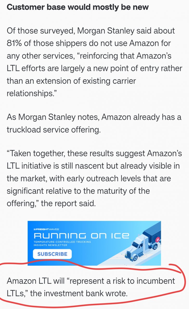I think it’s implied that the “risk” is in losing some market share to a new Amazon LTL division. No one expects them to come in, build up a network from scratch and immediately force other LTLs out of business.