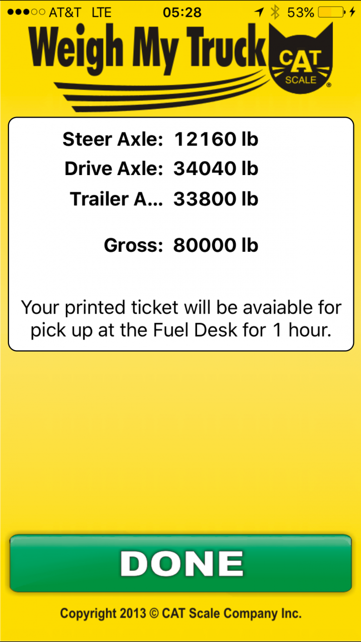 Now I run a split axle flatbed. I've CAT scaled this exactly three times in the last 16 months. Once to get my tare weight to let brokers know how much I can load.