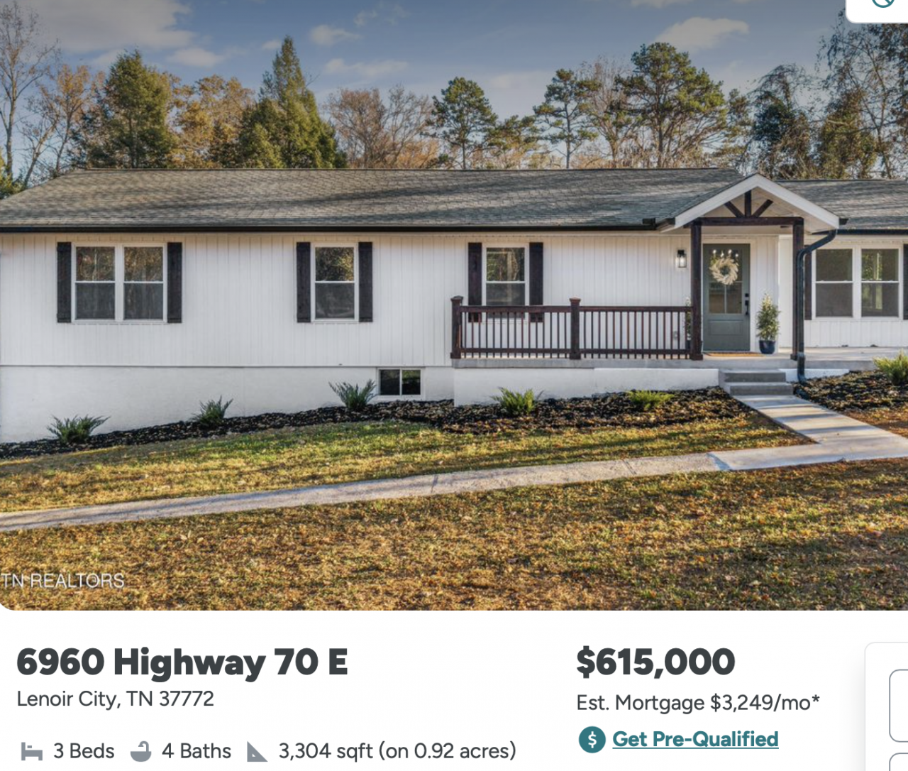 And way overpriced. Looking at the history, this sold for $375k last June. Right on US70, near Interstate 75, outside Knoxville. Probably won't be too many quiet nights, especially when there's a wreck on 75 or 40 (which happens quite a lot).
