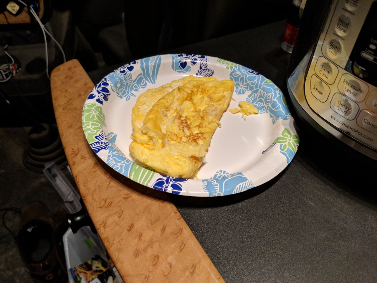 Decided to wake up early and make an omelette. Came out alright, but it burned a bit on medium saute, so I'd probably recommend low saute for two eggs.