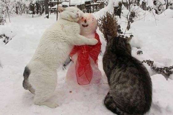 How did they get a cat to hug a mini snowman, dip the scarf in catnip? I love that pic! -