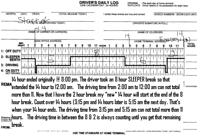 If he was attempting split break he would still be in violation! The driver did not have 8 hours in the sleeper so therefore he/she could not have driven passed that 14 hour mark! Remember once you enter lines 3 or 4 after a complete 10 hour break (or longer) your 14 hour clock starts, there is NO WAY to extend or stop it UNLESS you have 8 HOURS IN THE SLEEPER (ALL 8 MUST BE IN THE SLEEPER AND CAN BE MORE THAN 8 BUT ONLY THE TIME IN THE SLEEPER WILL EXTEND THE 14 HOURS).