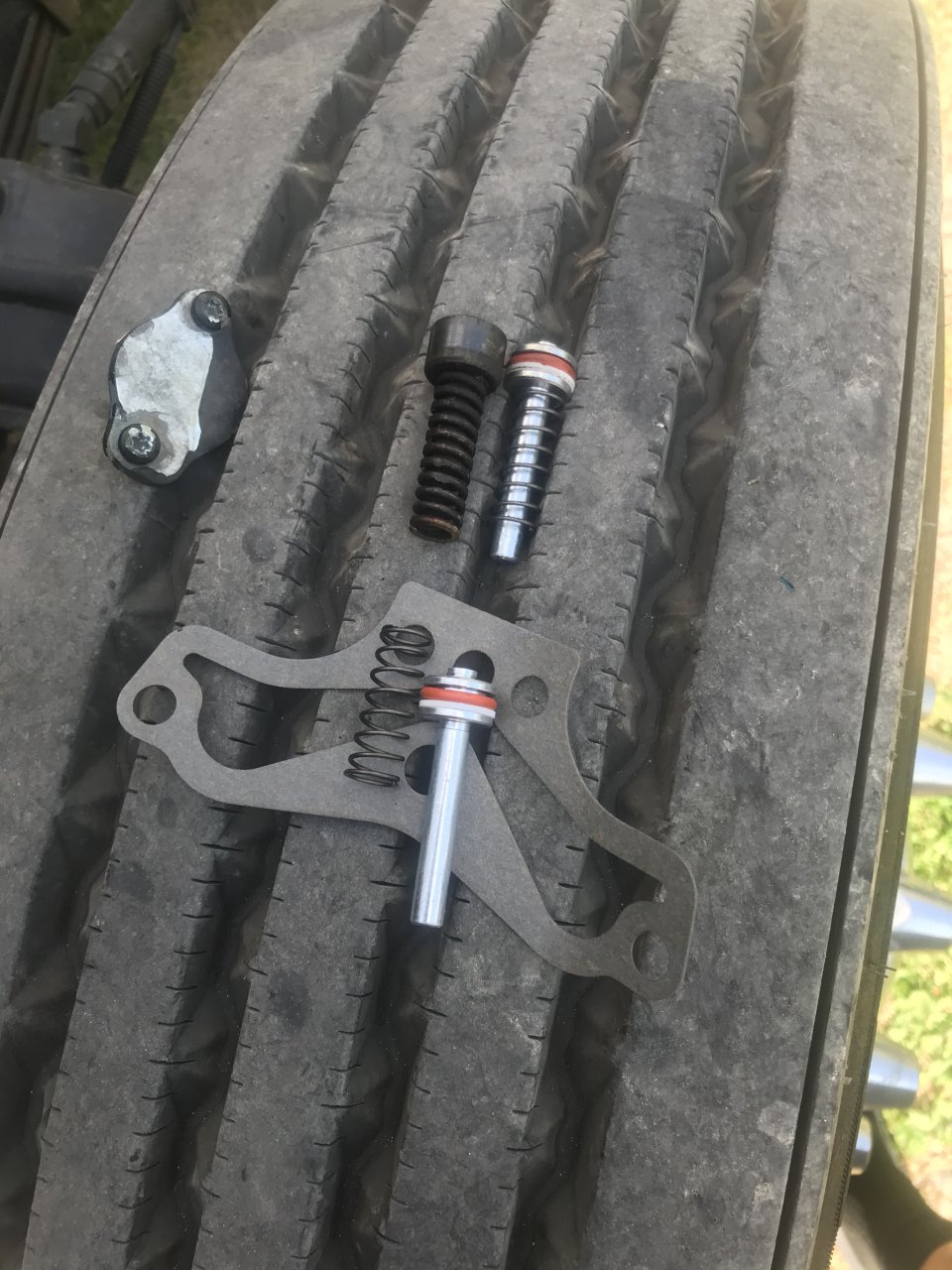 That gasket that is laying on the tire under that spring.... doesn’t go anywhere I can see.....that gasket came with that fresh spring and that bolt thing with the rubber seal on it. Only thing bad about a glider is I gotta know part numbers or at least exactly what specific part I’m looking for....