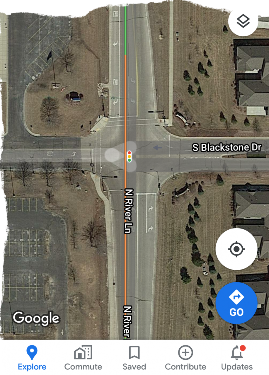 Or this turn in Winnipeg. Marion Ave and Archibald Street. My GPS is always telling me to turn left, I did once and hit the light pole. Just dented the bottom light there. I was committed to making the turn before I realized what was gonna happen.