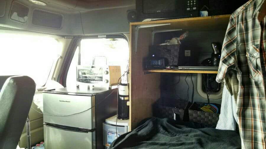 Hey man..cool set up...Just curious..I am a cooker..I would probably like to get a one or two burner for cooking...Is it possible to fit that in there somehow and be able to cook comfortably ? would you sit on a still or something and cook on top of the fridge ? Were you a cook yourself ? Also did you leave the curtain in there ? How hard is it to change clothes in that smaller space ? thanks, BT