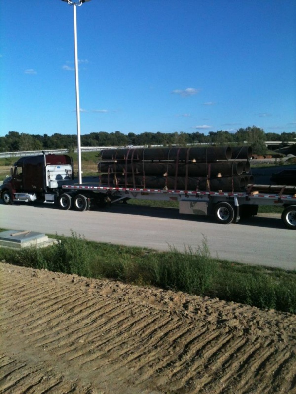 This load was a real challenge. They first tried to load it in two stacks. Problem is the pipes are 27' long, trailer is 48'. But they had to try as these boys down here in MO aren't too good with math. So then they had to off load three pipes. After much debate one of the fellas came up with the idea of going 3 high, wow it was like showing fire to a caveman, as they all grunted at the idea. They were less impressed with my suggestion of centering the load on the trailer from side to side, like that really matters. So I get all my gut straps on and a few chains, then look at it and think I really hate this load. So I throw a few more chains at it. All in all only took 5 hours! Got my boots muddy to! Off to Cleveland in the morning.