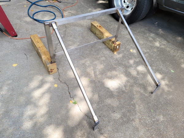 This is assembled, imagine the ground as the back of the cab for perspective. The "feet" at the lower end fit under the cab, secured with bolts going straight upward into the structural beam they lay against. Since they extend about 4 inches under the cab, I set the frame up on 4x4's to make sure I had the angles right on the legs.