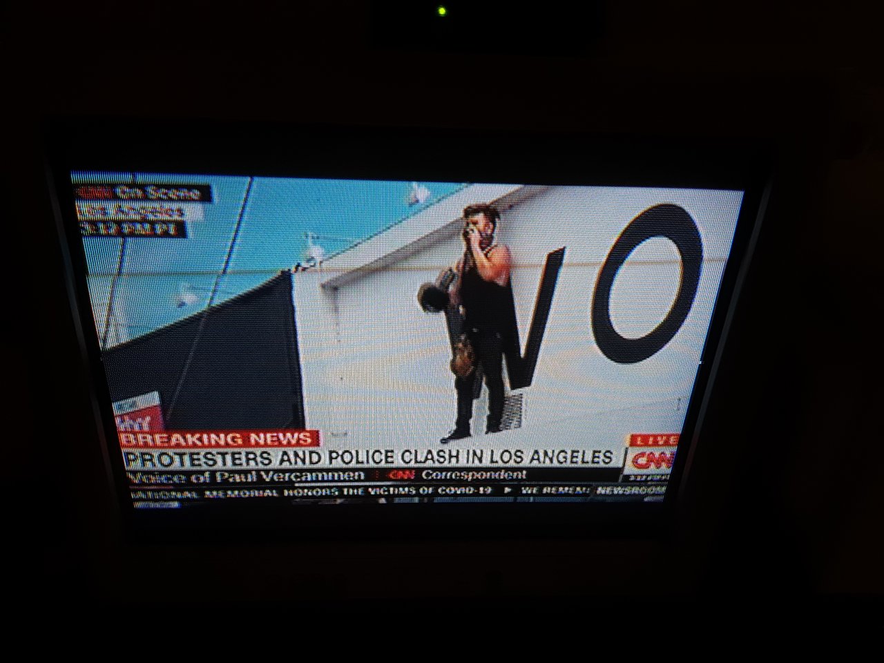 See the guy on the top of the building with megaphone telling police to back off and stop hitting people...