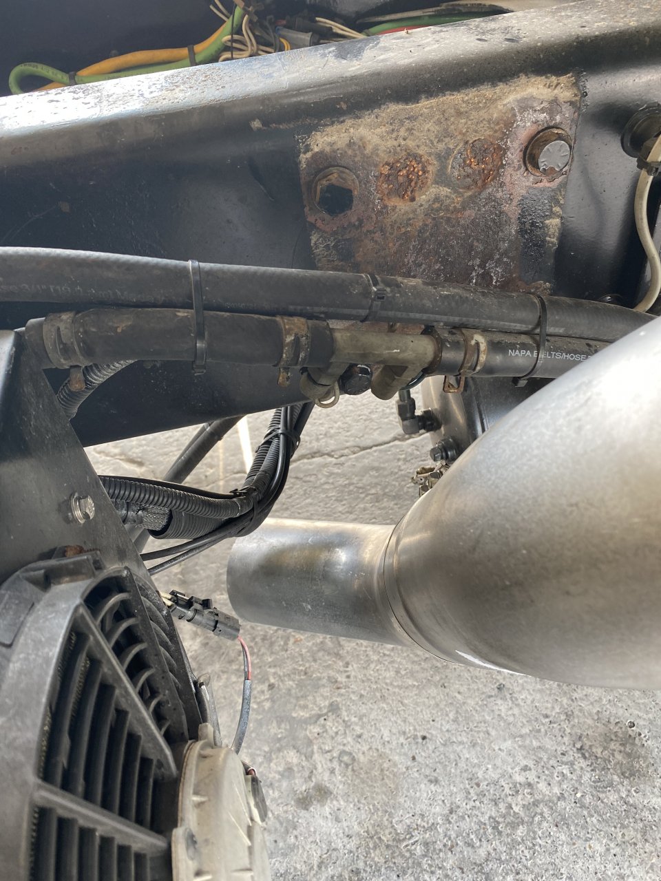 First, we had to remove the stack and make some sort of weed burner setup. I didn’t want to run open pipes and have loud jakes, so I bought a shorty muffler (it’s only about a foot long)….I shoulda saved that $80. I knew better. I’ll have to figure out how to quiet her down later.