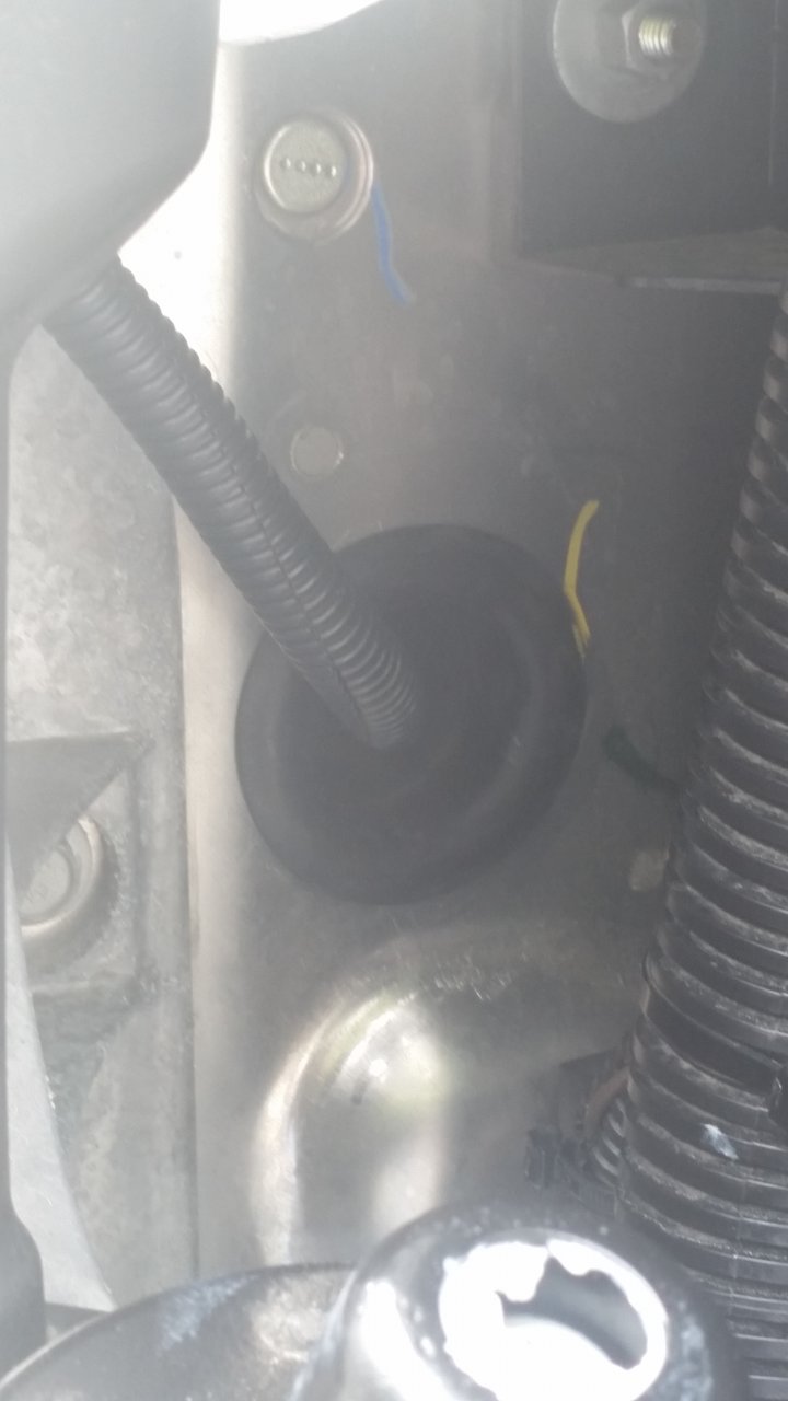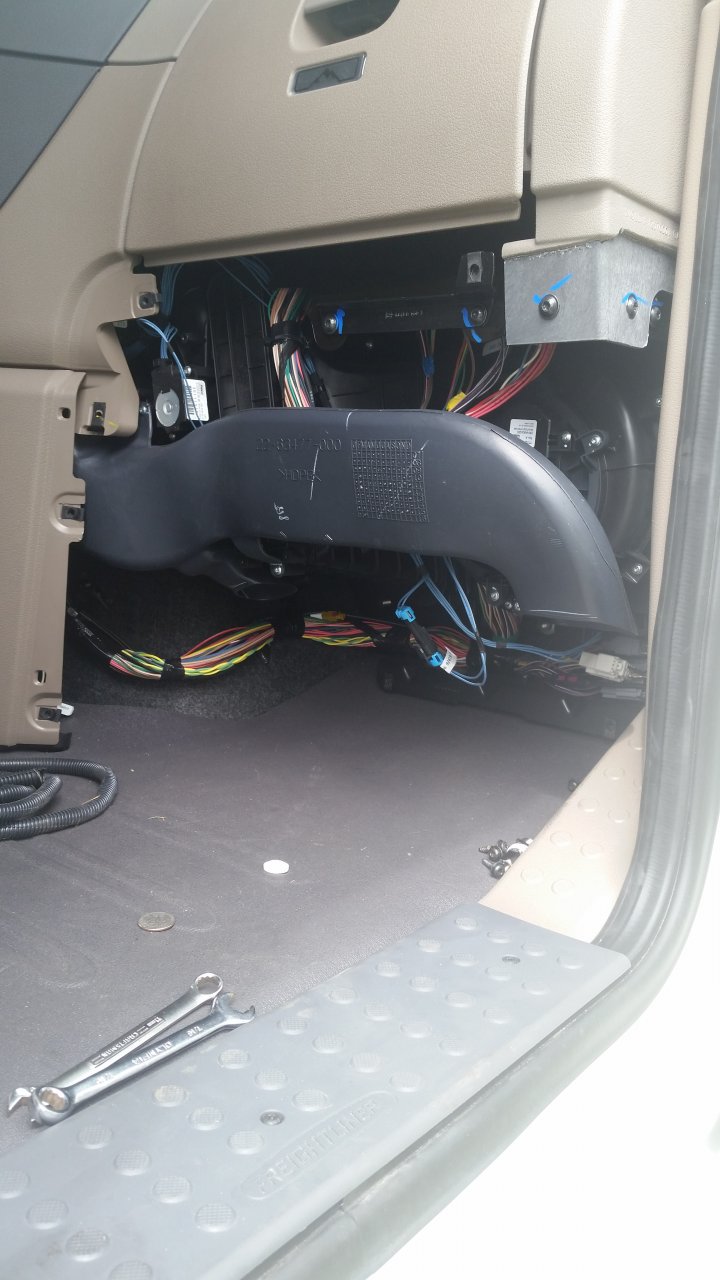 Next remove the 6 or 8 (I forget how many?) T25 passenger lower kick panel screws. If you push 6" through the grommet, you'll see it. Back it out if needed and route it under all other wiring. Then pull it all the way through.