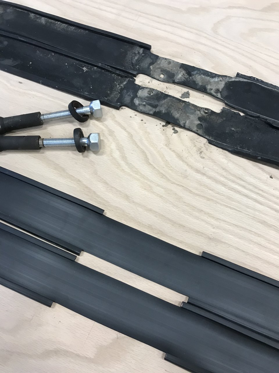 I've given up on rubber strips. They don't last. I use 2" cargo straps....and stainless nuts and bolts
