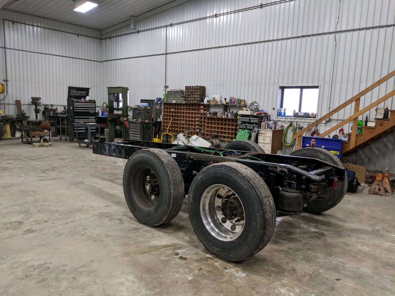 Was able to use the yolk off the old rear end. Got the catwalk and headache cabinet removed, and brakes caged. Took a chunk of the new frame to the shop so they could bend up the sleeves.