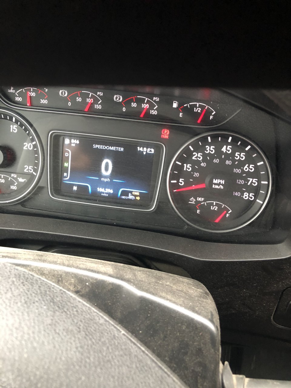 I dont know jack about the new trucks, but that little symbol where the 'CMS' is has a truck with the little yellow things in front of it... could it be something to do with that collision avoidance junk? Something blocking your front sensor or something unplugged?