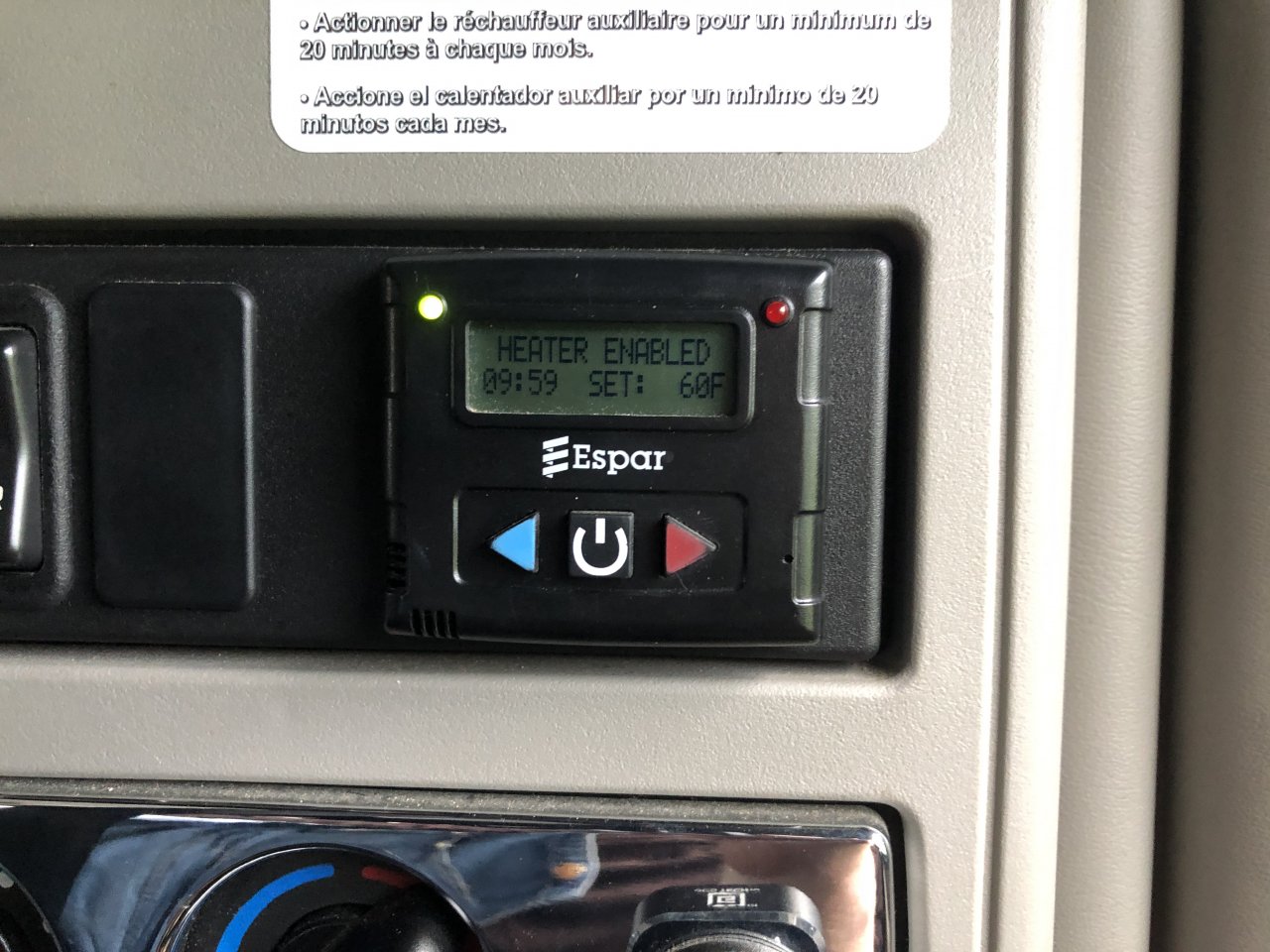 That espar button you pushed is only blowing air like a fan but not AC. But it will give you good heat in the winter.